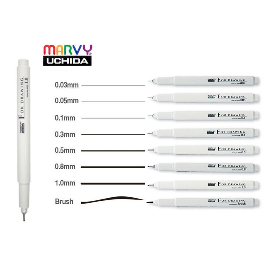 Černý technický popisovač vodě odolný. Osm různých hrotů. Vhodné pro technické kreslení, komiksy, kontury atd. Netoxické složení, dokumentní inkoust.