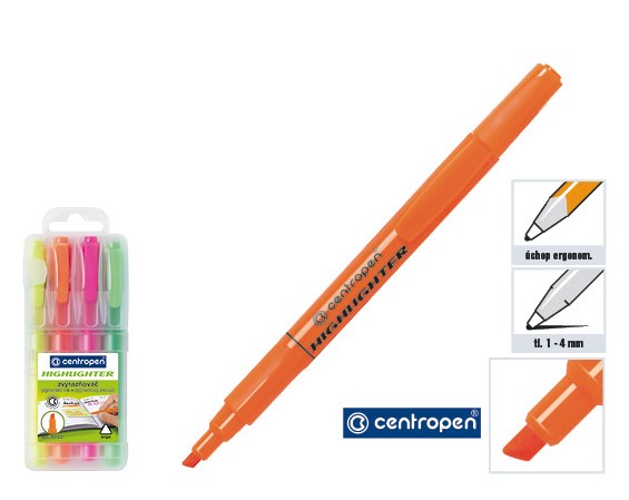 Sada zvýrazňovačů se světlostálým pigmentovým inkoustem. Zvýrazňovač je vhodný pro psaní na všechny druhy papíru. Je použitelný i na faxový a samokopírovací papír. Klínový hrot, šíře stopy 1 - 4 mm. Ventilační chránítko.