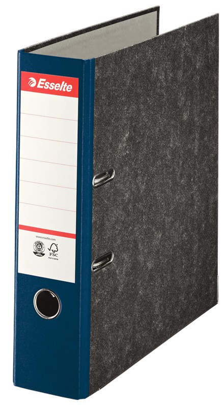 Formát A4 s vnějším potahem z tmavého mramorovaného papíru, barevným hřbetem a vnitřním potahem ze světlého mramorovaného papíru. Hřbetní otvor pro snadnou manipulaci, kovové lišty pro delší životnost, uzavírací mechanismus drží pořadač vždy pevně zavřený. Hřbet šíře 7,5 cm, barva modrá.