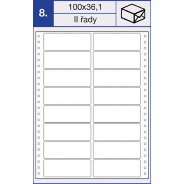 Etikety na podkladu o délce 12“ v nekonečném „traktorovém“ provedení, vhodné pro tiskárny s vodícím mechanismem. Etikety v bílé barvě, 2řadé