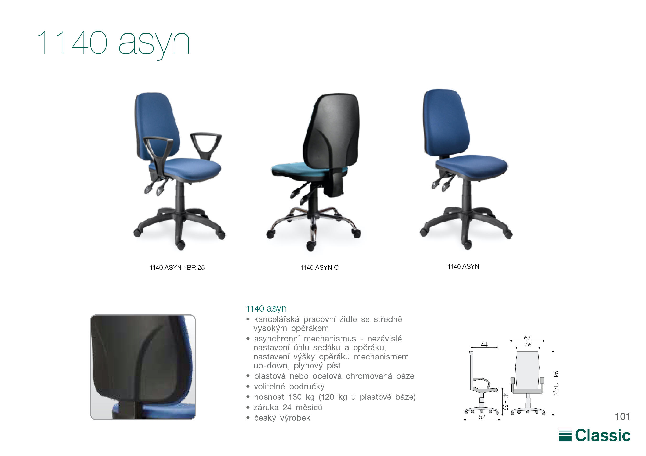 kancelářská pracovní židle s středně vysokým opěrákem, asynchronní mechanismus - nezávislé nastavení úhlu sedáku a opěráku, nastavení výšky opěráku mechanismem up-down, plynový píst, volitelné područky, nosnost 120 kg, záruka 24 měsíců, český výrobek