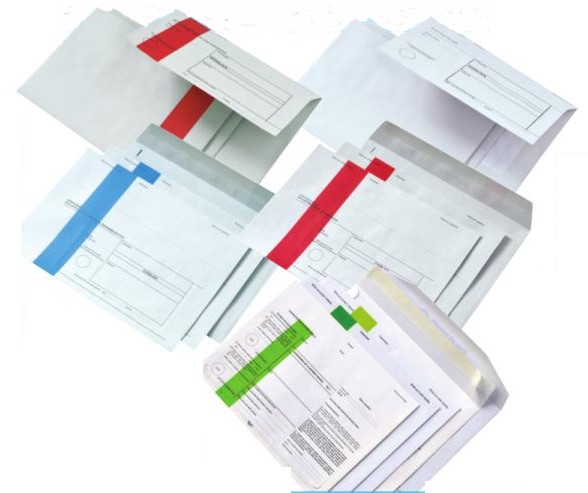 Dodejkové obálky s vytrhávacím nepropisovacím okénkem a s poučením na zadní straně, 80 g bílý ofset, vlhčící.