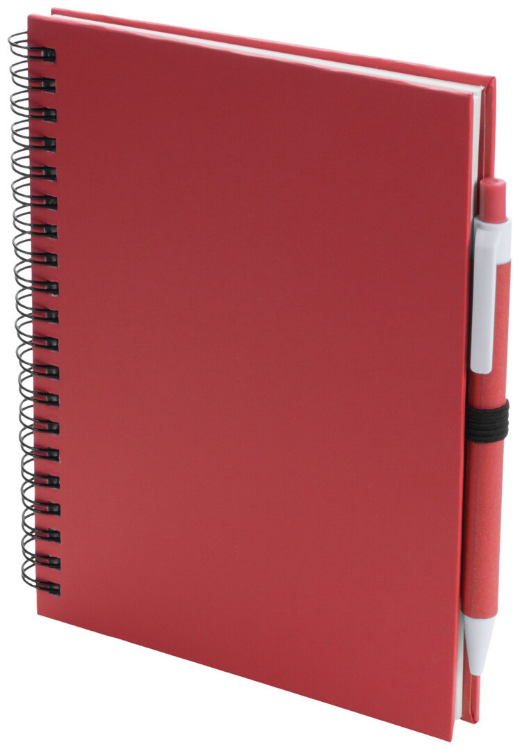 Poznámkový blok se 70 čistými listy a spirálovou vazbou v kartonových deskách, vč. stejně barevného kuličkového pera z recyklovaného papíru s modrou náplní.