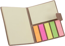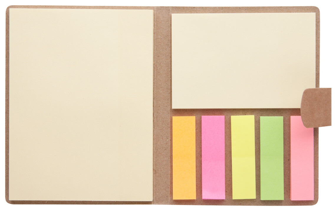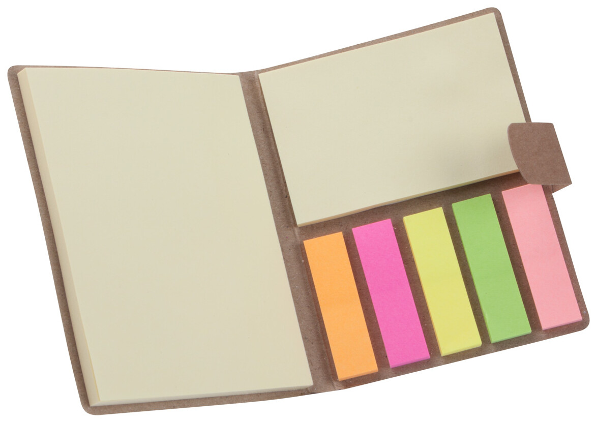 Samolepící poznámkový blok s 50 velkými a 25 středními poznámkovými lístky a 125 značkovači stránek (v 5 různých barvách) v recyklovaném papírovém pouzdře.