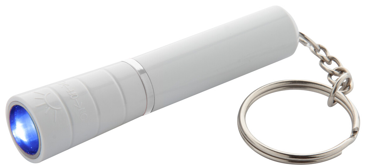 Plastová mini baterka s 1 LED a kovovým kroužkem na klíče. S knoflíkovou baterií.