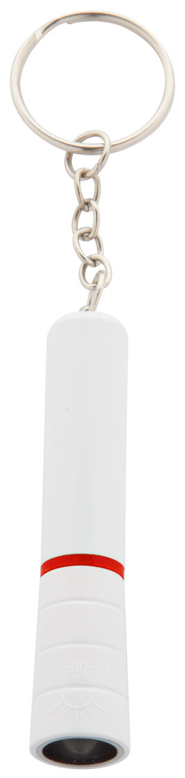 Plastová mini baterka s 1 LED a kovovým kroužkem na klíče. S knoflíkovou baterií.