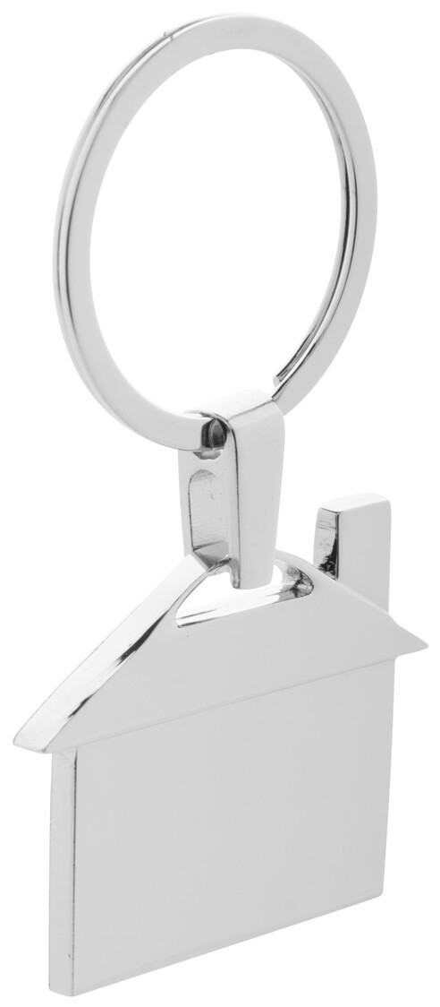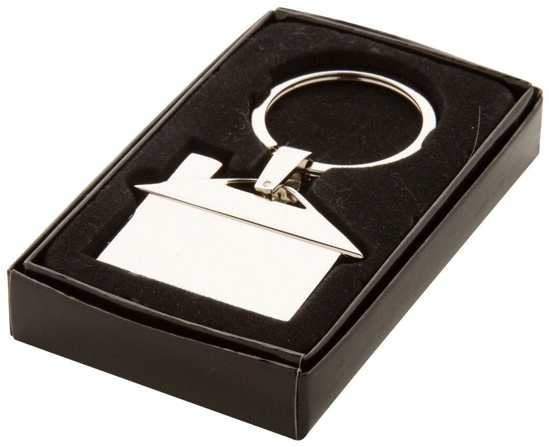 Kovový přívěšek na klíče ve tvaru domečku, v černé dárkové krabičce.