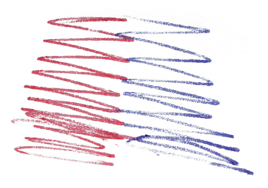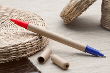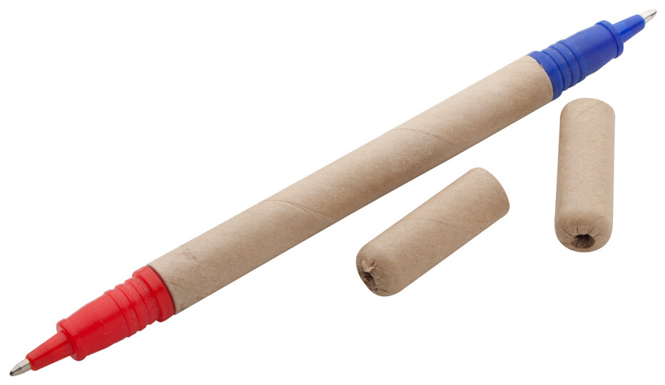 Oboustranné kuličkové pero z recyklovaného papíru a s červenou a modrou náplní.