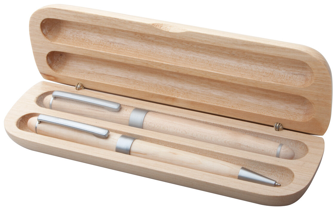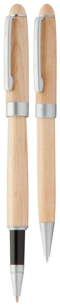 Dřevěná sada per s kuličkovým perem a rollerem v dárkové krabičce. S modrou náplní.