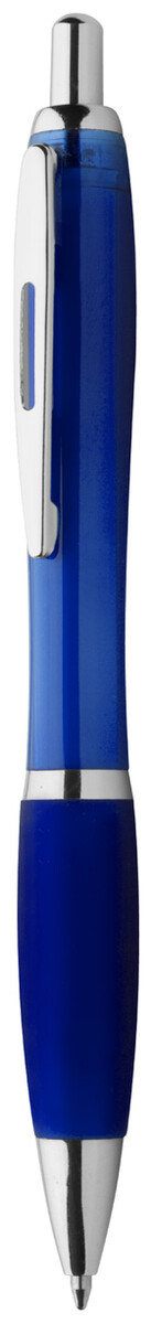 Plastové kuličkové pero s průhledným tělem, úchopem v odpovídající barvě a lesklými chromovanými částmi. S modrou náplní.