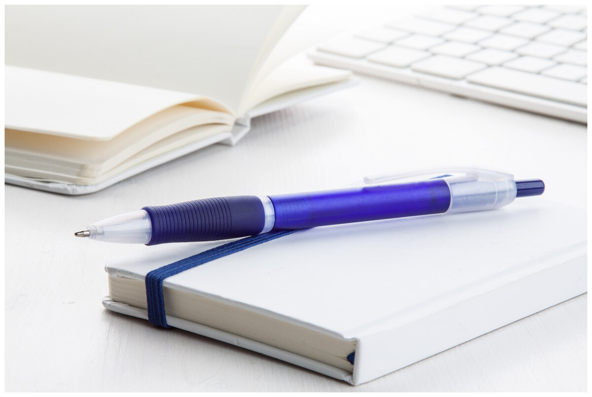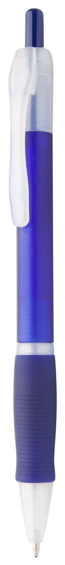Plastové kuličkové pero s pogumovaným gripem a s modrou náplní.