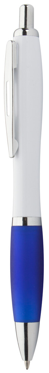 Plastové kuličkové pero s bílým tělem, barevným úchopem a lesklými chromovanými částmi. S modrou náplní.