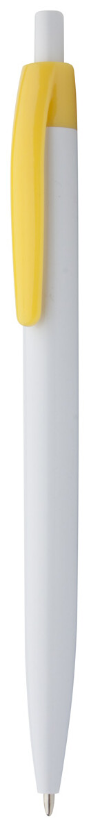 Plastové kuličkové pero s bílým tělem a barevným klipem, s modrou náplní.