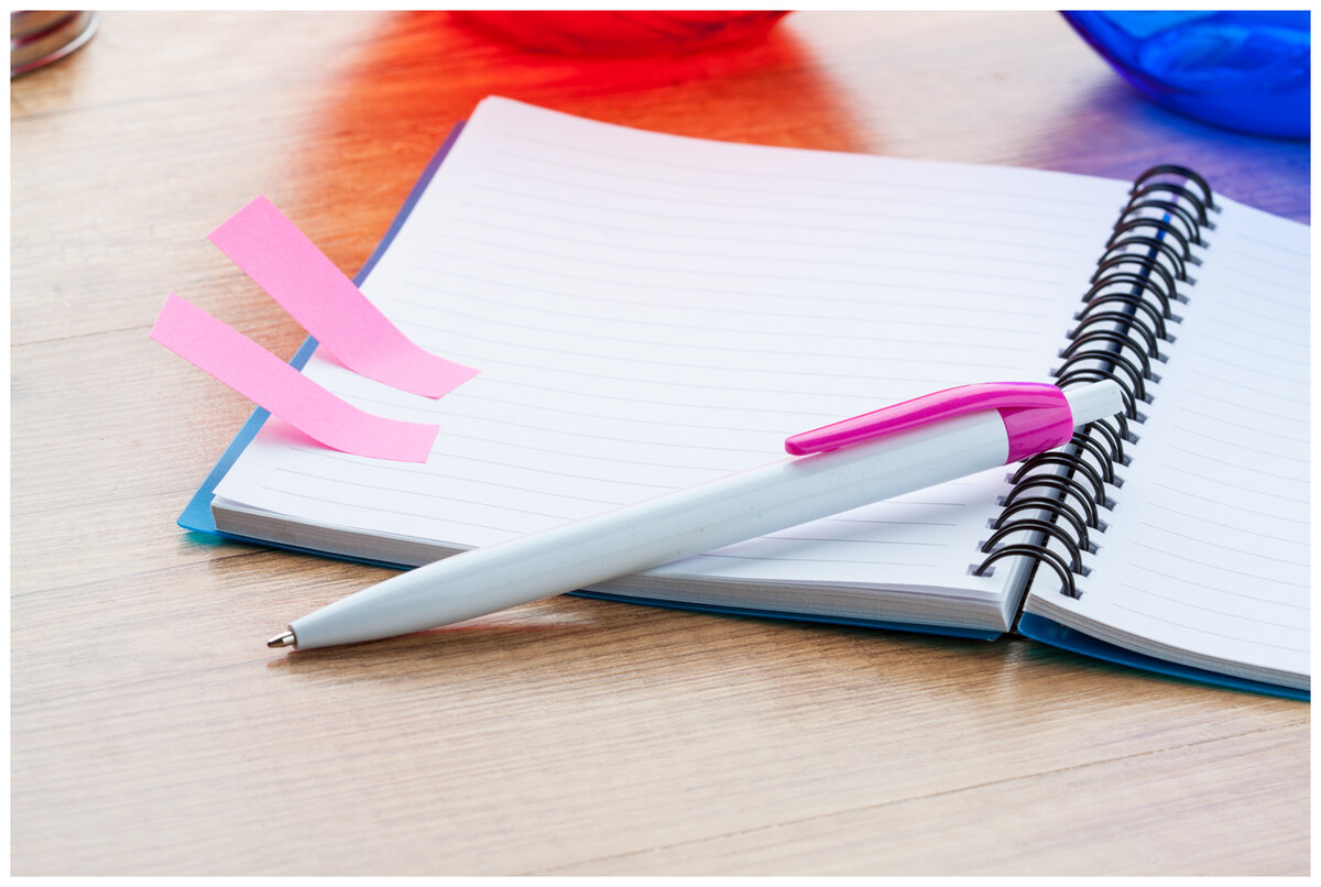 Plastové kuličkové pero s bílým tělem a barevným klipem, s modrou náplní.