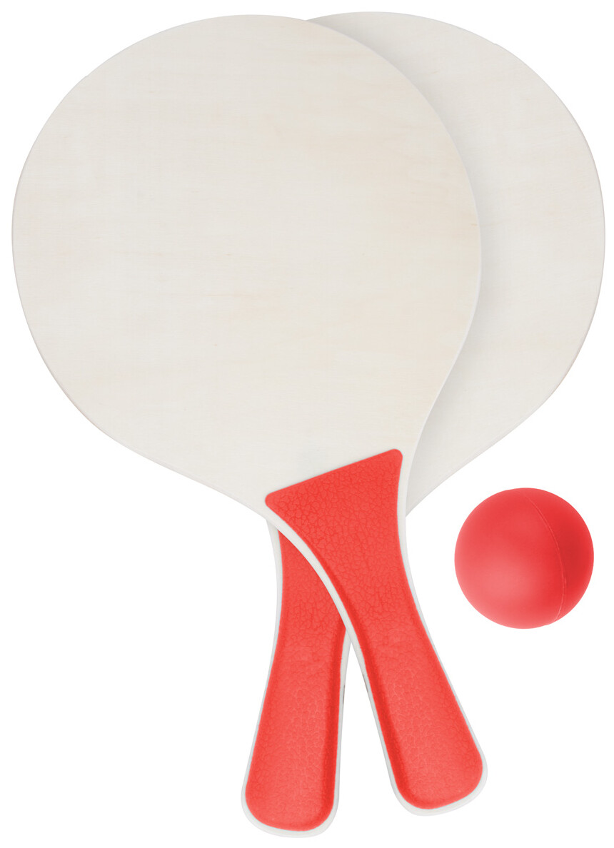 2 rakety a jeden míček, vyrobeno ze dřeva a plastu.