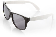 Plastové sluneční brýle s černými obroučkami a barevnými nožičkami.