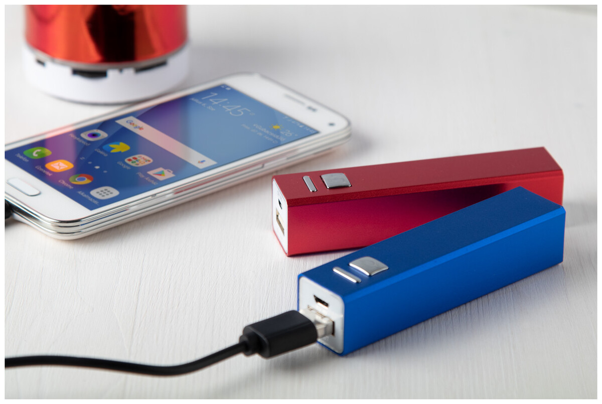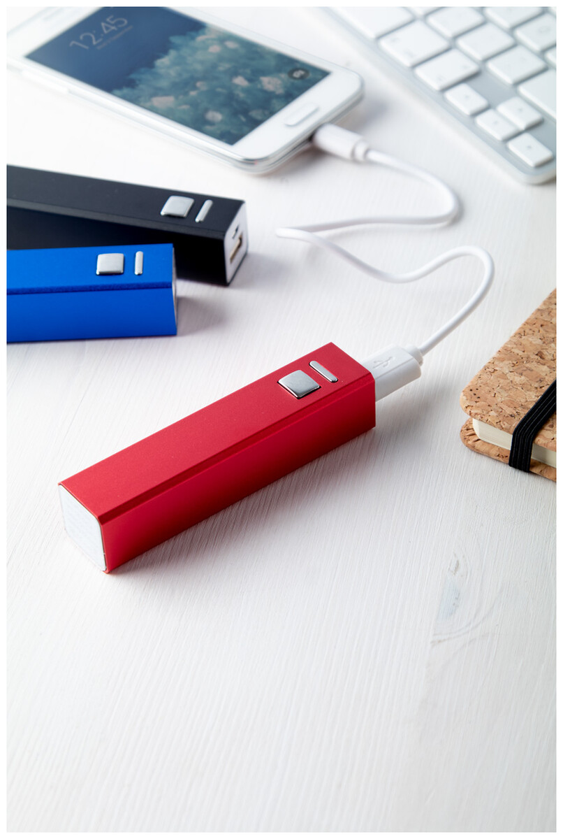 Hliníková USB power banka s 2200 mAh baterií, vč. mikro USB nabíjecího kabelu.