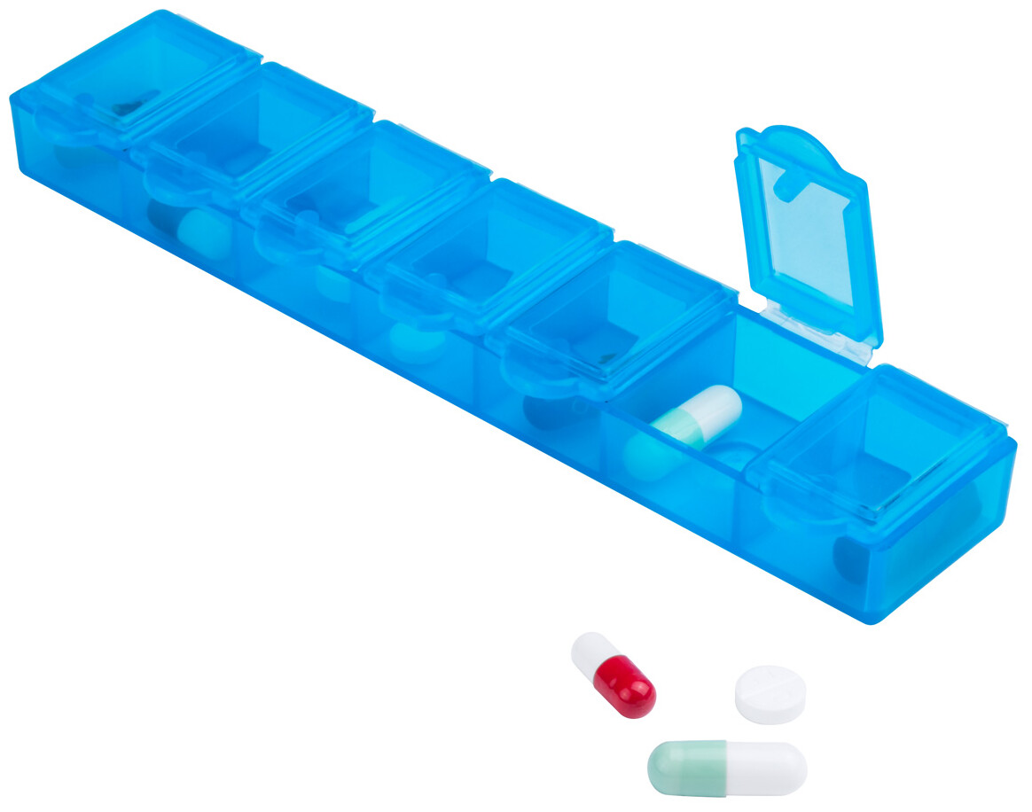 Plastový, týdenní box na pilulky, se 7 přihrádkami.