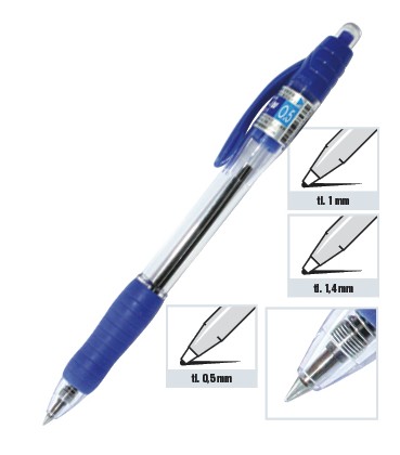Kuličkové pero s gumovým úchopem, vyměnitelná náplň Any ball, šíře stopy 0,5 mm, 1 mm nebo 1,4 mm, plastové tělo v barvě náplně.