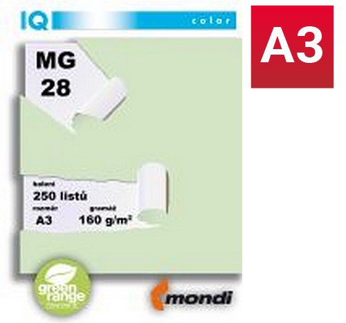 Barevný papír IQ MG28, A3, 160g, pastelová středně zelená, 1 balení, 250 listů. Papír velkého formátu A3.