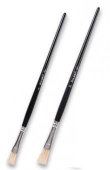 Plochý štětec z prasečí štětiny, bezešvá hliníková zděř, násadka lakovaná v lesklé černé barvě. Štětec vhodný ke školnímu použití a při malování po povrchu při ručních pracích.