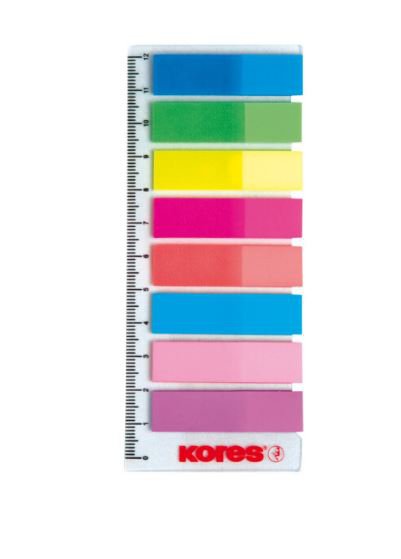 Záložky v 8 fluorescentních barvách na praktickém pravítku, záložky jsou plastové – netrhají se, přesto jsou popisovatelné, můžete je opakovaně aplikovat, vzájemně se neslepují a nekroutí.