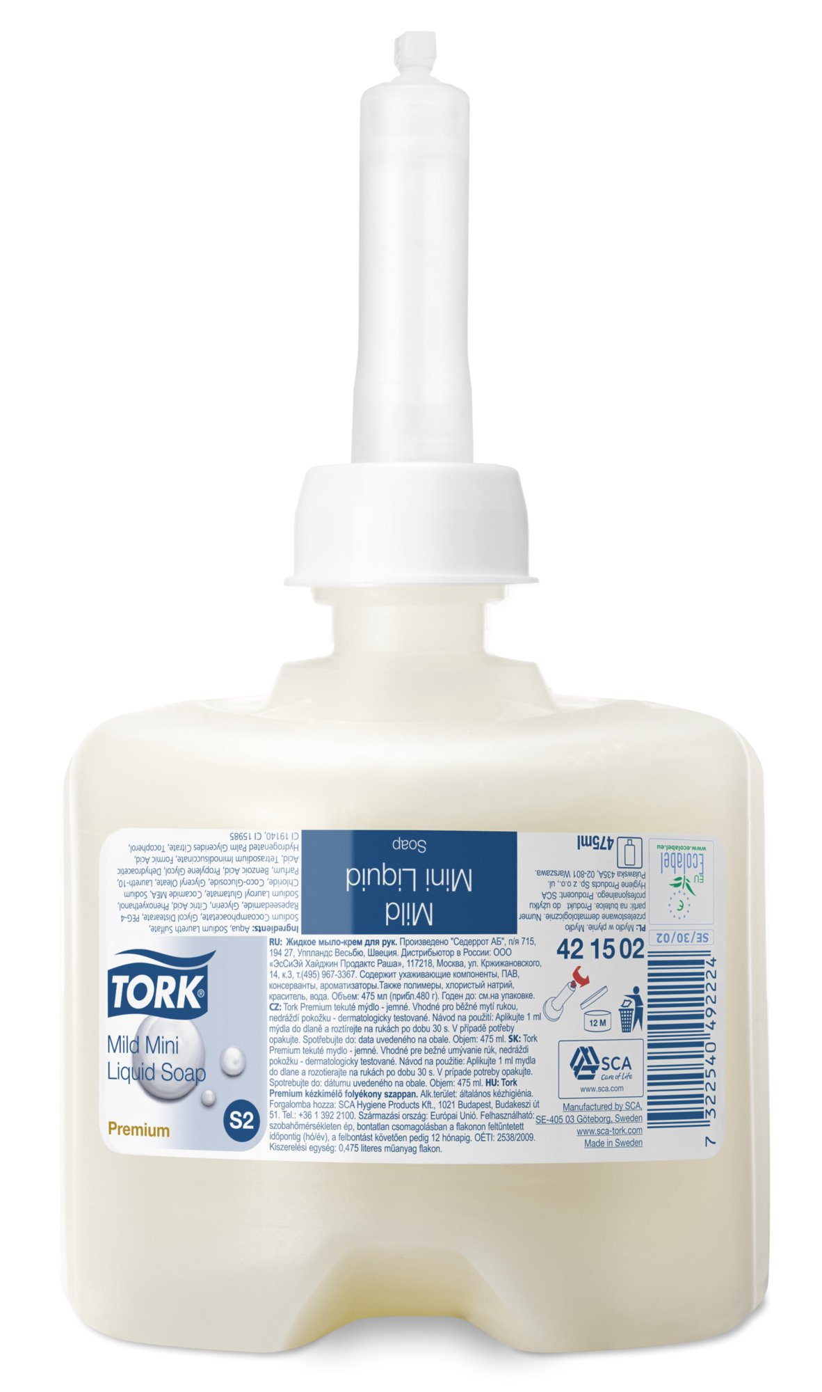 Tekuté mýdlo Tork 420502, mini, jemně parfémované, 475 ml, systém S2 je kvalitní tekuté mýdlo s jemnou svěží vůní, vhodné pro každodenní mytí rukou. Je určeno pro použití v malých zásobnících Tork S2, ideální pro kanceláře, školy, hotely a další veřejné prostory.