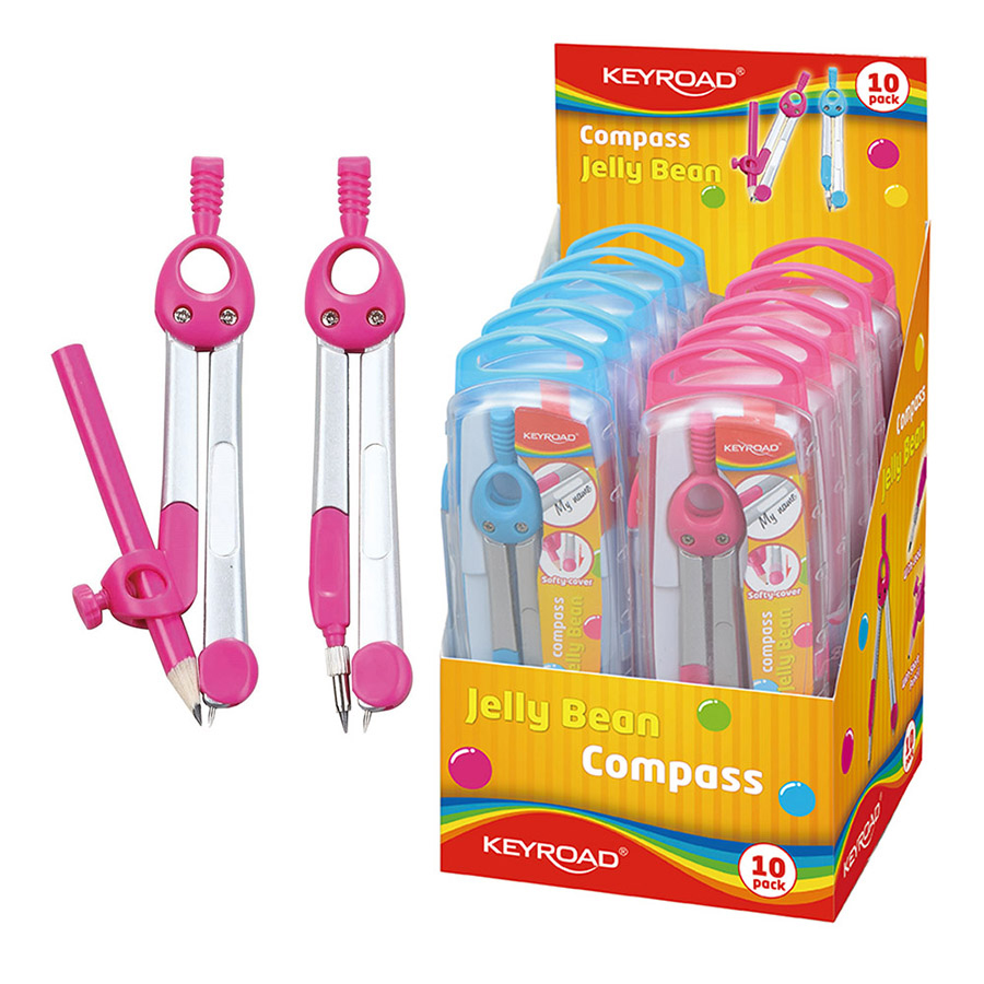 Kovové kružítko s držákem tuhy a univerzálním držákem vhodným pro tužku. Kružítko je vybaveno chránítkem ostrého hrotu zabraňující poranění nebo poškození penálu. Každé kružítko má na rameni plochu vhodnou k podepsání. Balení obsahuje kružítko, etui se 2 náhradními tuhami, krátkou grafitovou tužku a univerzální držák. Dodáváno v mixu 2 barev.