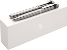 Elegantní dárková sada s propiskou a rollerem v bílé krabičce se značkou GABRIELIS. Tužky mají otočný mechanismus, roller odnímatelné víčko. Povrch tužek leskle šedý se stříbrným klipem v černém úchytu.