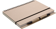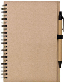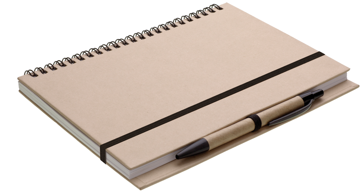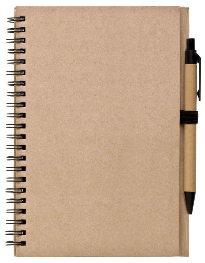 Blok A5 s kroužkovou vazbou v pevných kartonových deskách. 60 listů bílého papíru, baleno v sáčku. Součástí bloku je papírová propiska s černým doplňkem připevněná na přinýtovaném poutku.