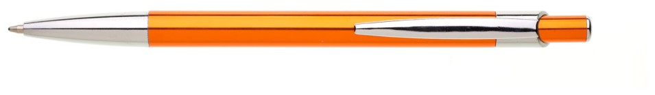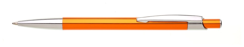 Kovová oranžová propiska s lesklým povrchem a charakteristickou protáhlou špičkou. Špička i klip jsou pochromované.