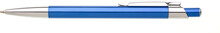Kovová modrá propiska s lesklým povrchem a charakteristickou protáhlou špičkou. Špička i klip jsou pochromované.