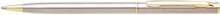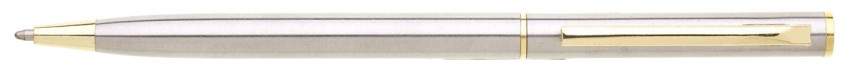 Tenká propiska s otočným mechanismem o rozměrech 130x 7,5 mm. Materiál - nerezová ocel, náplň modře píšící.