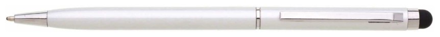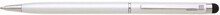 Tenká stříbrná kovová propiska s otočným mechanismem a touch koncem. Stříbrné, chromové doplňky, náplně cross, modře píšící. Materiál hliník.