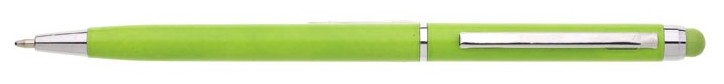Plastové, kuličkové pero s tenkým, světle zeleným tělem a s chromovými doplňky. Pero má otočný mechanismus a na konci těla touch pro dotykové displeje v barvě těla. Náplň X 20, modře píšící.