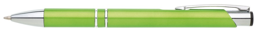 Plastové propisovací pero OIRA - ve světle zelené barvě. Pero je zdobené dvěma stříbrnými proužky. Na těle je zdobeno oválným výřezem. Pero má náplň velkoobsahovou, modře píšící.