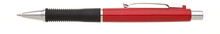Kuličkové pero PRIOLA červené, má úchop z černého, pogumovaného vroubkovaného materiálu. Doplňky pera jsou ve stříbrné barvě.