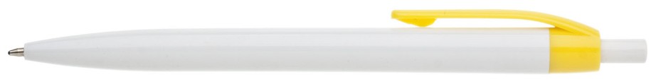Plastové, kuličkové pero LIDO má bílé tělo a žlutý klip. Má náplň X-20 (106mm), modře píšící.