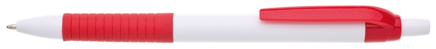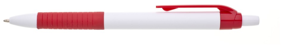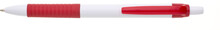 Propiska s bílým tělem, červeným gripem a klipem, náplň modře píšící.