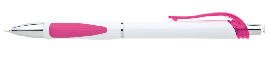 Bílá, plastová propiska s pochromovanými doplňky jako jsou klip, tělo cvakátka a proužek uprostřed těla tužky. Grip je růžový, částečně pogumovaný, stejně jako klip. Náplň X20, hrot 0,5mm.
