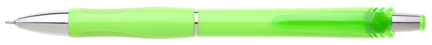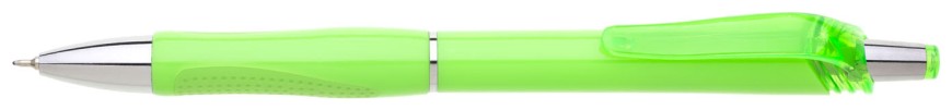 Neonová zelená plastová propiska s transparentním klipem a stříbrnými doplňky. Náplň X20 s mikrohrotem 0,5 mm, semi gel,modře píšící.