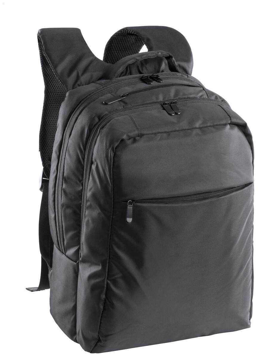 Batoh s mnoha přihrádkami na zip, vypolstrovanou přihrádkou na laptop (15"), vypolstrovanými zády a popruhy, 600D nylon.