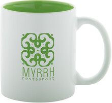 Witte keramiek mok met gekleurde binnenkant, de gegraveerd kleur is hetzelfde als de kleur van de binnenkant. In geschenkverpakking. Inhoud: 350 ml.