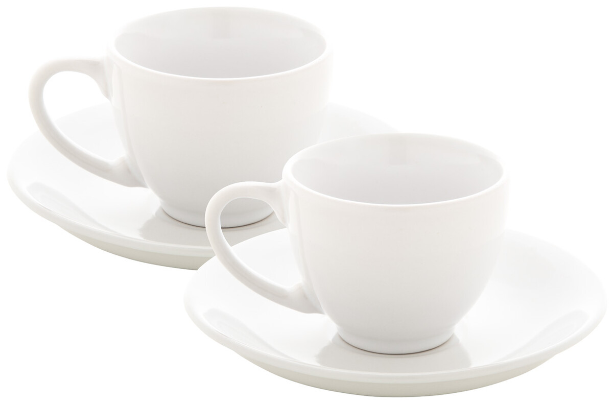 Keramická sada 2 ks šálků s podšálkem na espresso, 90 ml. V bílé papírové krabičce.