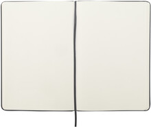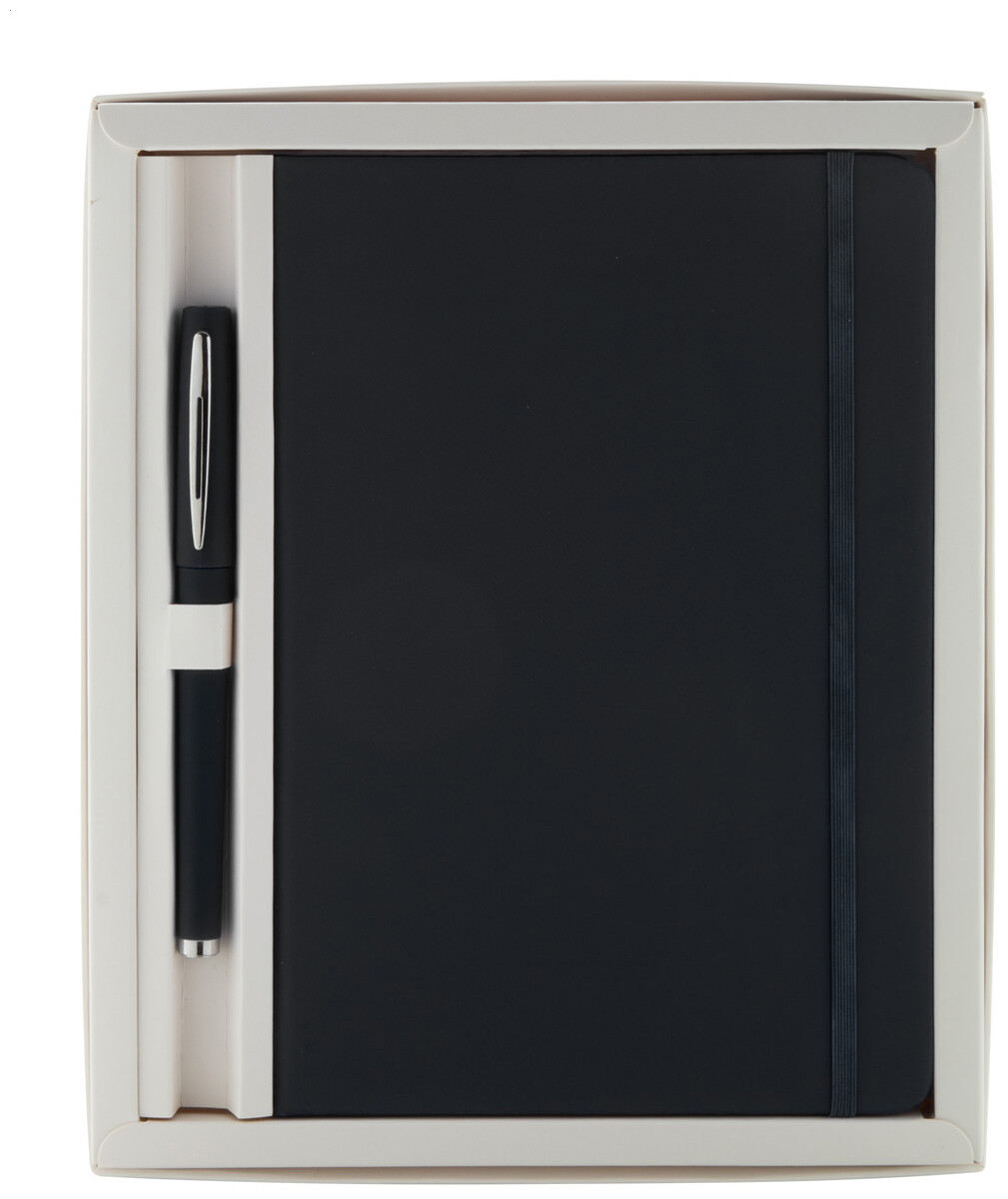 Sada s blokem s deskami z PU kůže se 100 čistými listy a stejně barevným plastovým kuličkovým perem s modrou náplní, v bílé dárkové krabičce.