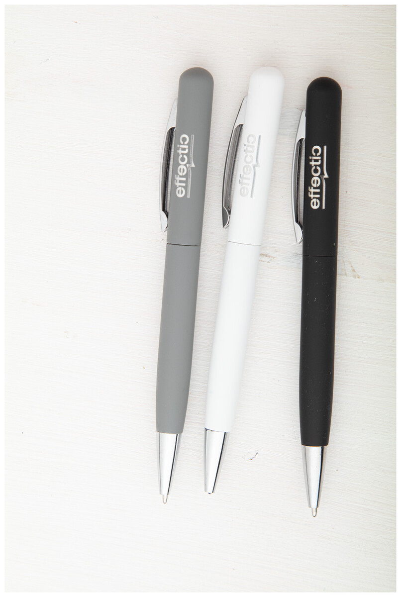 Kovové twist kuličkové pero s pogumovaným povrchem a modrou náplní. Speciální povrch pro laser stříbrného loga.