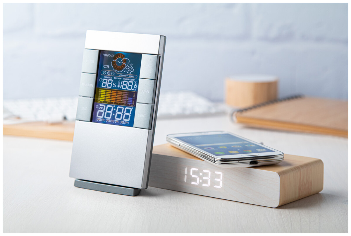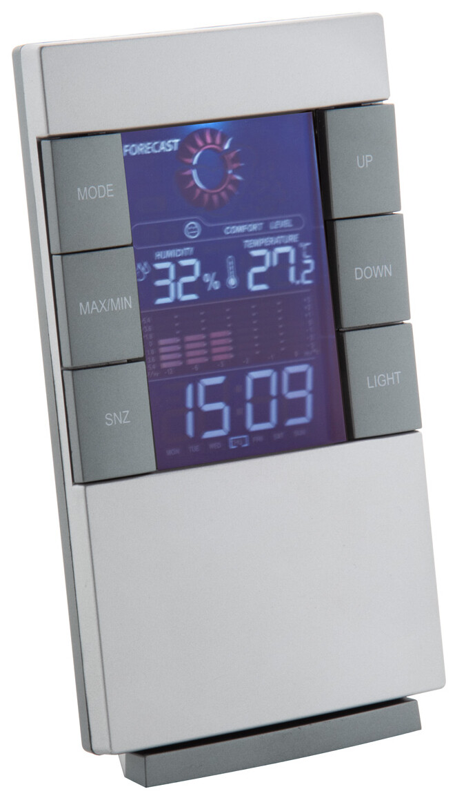 Digitální meteostanice s hodinami s barevným displejem. Funkce: budík, teploměr, vlhkoměr a paměť 12ti hodinového vývoje teploty. Dodáváno bez 2 ks AAA baterií.