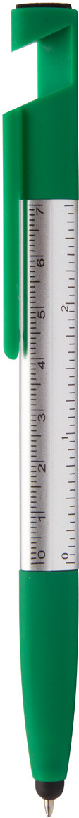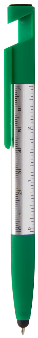 Plastové kuličkové a dotykové pero 5v1 se stojánkem na mobil, pravítkem, čistítkem a s funkcí šroubováku, s modrou náplní.