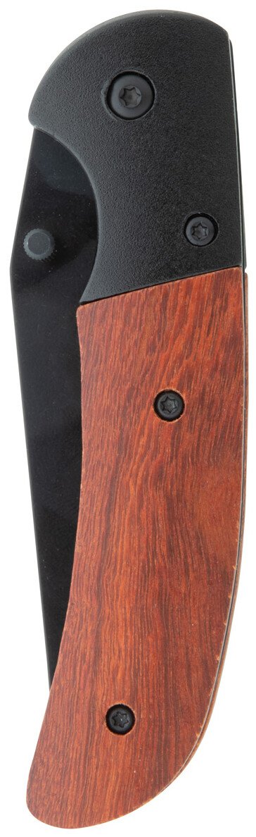 Kapesní nůž z nerez oceli s dřevěnou rukojetí a bezpečnostní pojistkou.