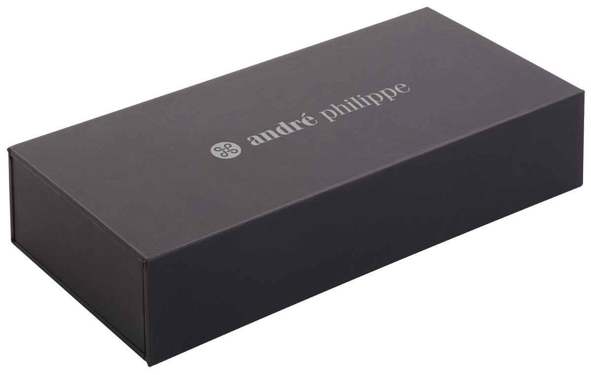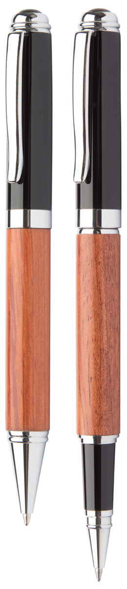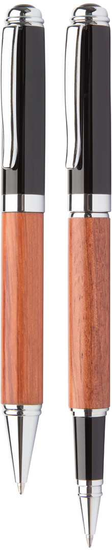 Elegantní sada kovového kuličkového pera a rolleru s tělem v růžovém dřevu. V dárkové krabičce z PU kůže a s modrou náplní. Značkový produkt André Philippe.